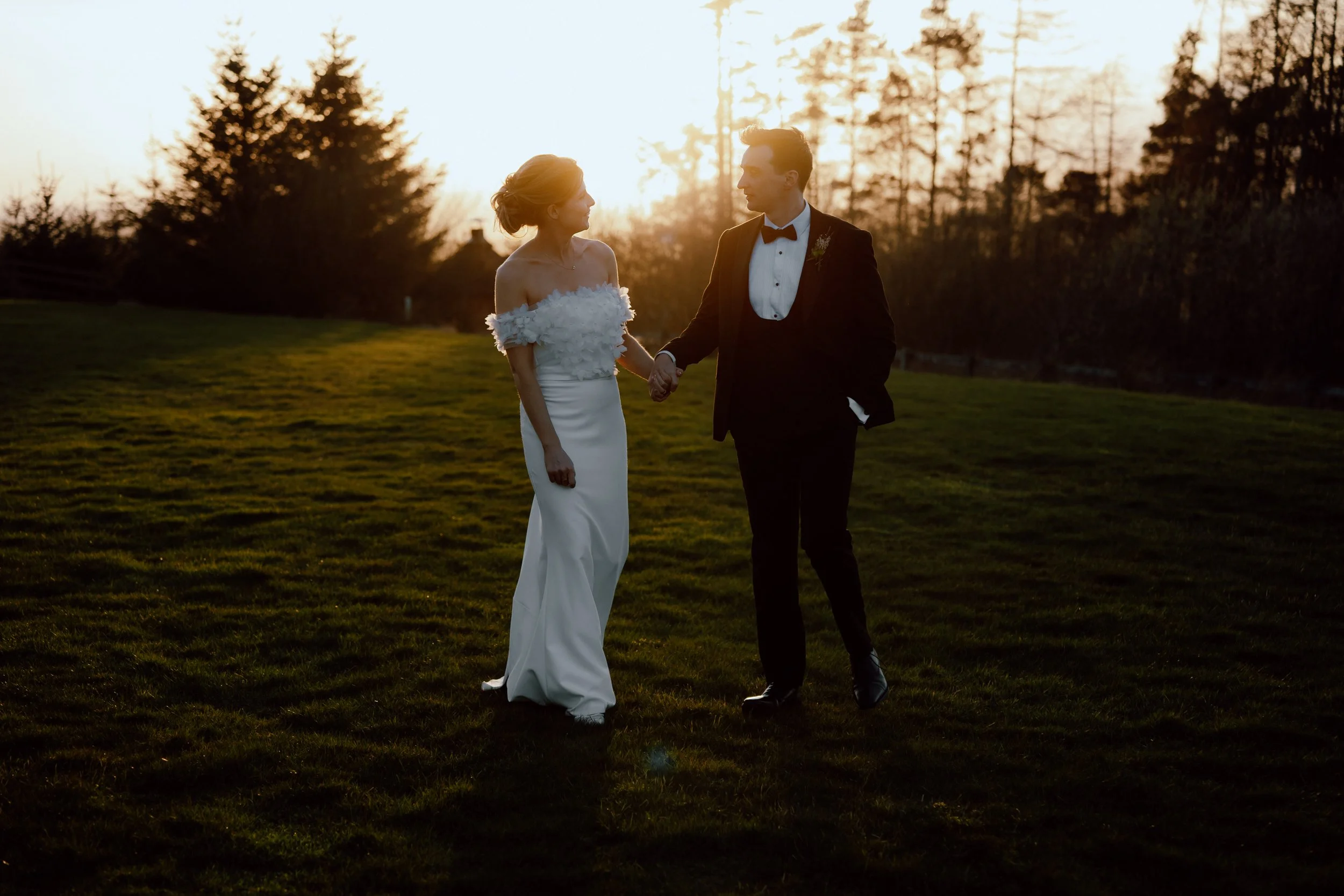 The light was low, golden, almost slipping away behind the trees. Emily and Kevin moved quietly together across the grass, hand in hand, with that soft stillness that only exists at the end of a wedding day. No rush, no direction — just the two of them, soaking it all in.